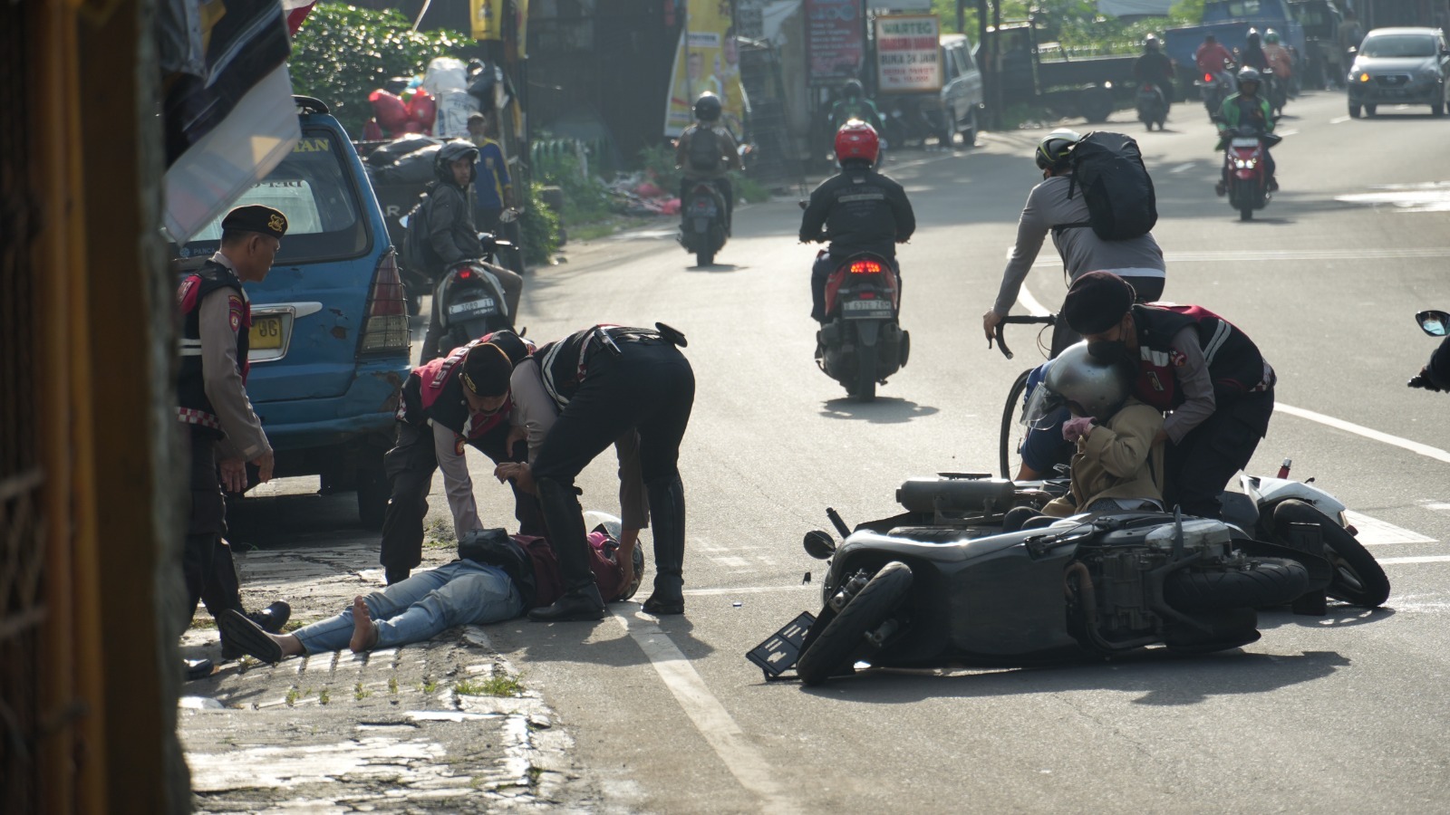 Kedua, memberikan pertolongan pertama kepada para korban, Ketiga, mengevakuasi korban ke tempat yang aman dan memindahkan kendaraan dari badan jalan.